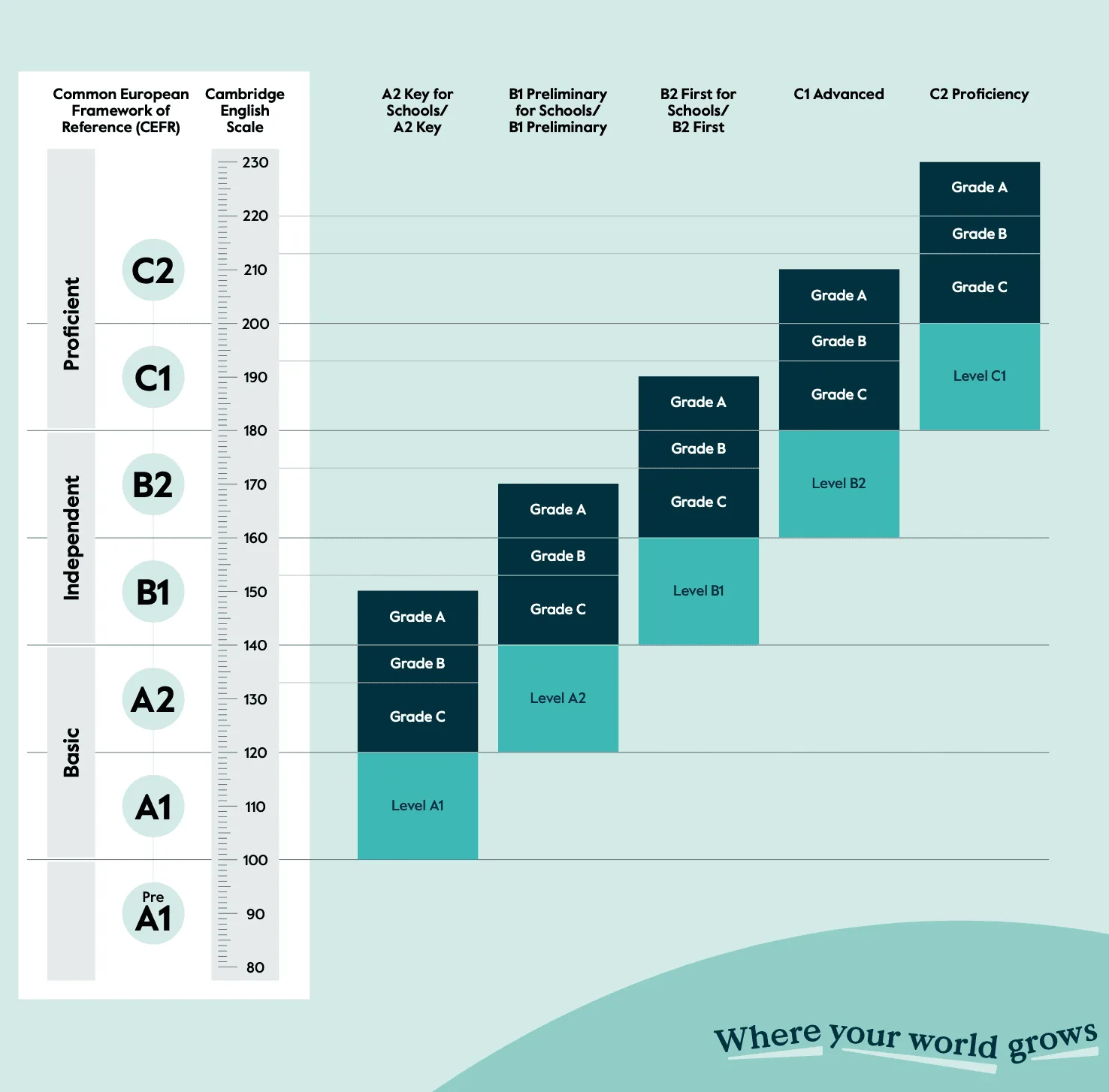 Nuestro sistema de enseñanza proporciona un aprendizaje sólido y continuo, paso a paso, y a medida que vayan avanzando los alumnos se presentan a los titulaciones de Cambridge English como forma de animarles a mejorar su comprensión y expresión oral y escrita, además de acreditar los logros conseguidos. Iniciando sus cursos con 4 o 5 años nuestros alumnos alcanzan el nivel B2 (First Certificate) en 4º de ESO y los que comienzan más tarde, el nivel B1.